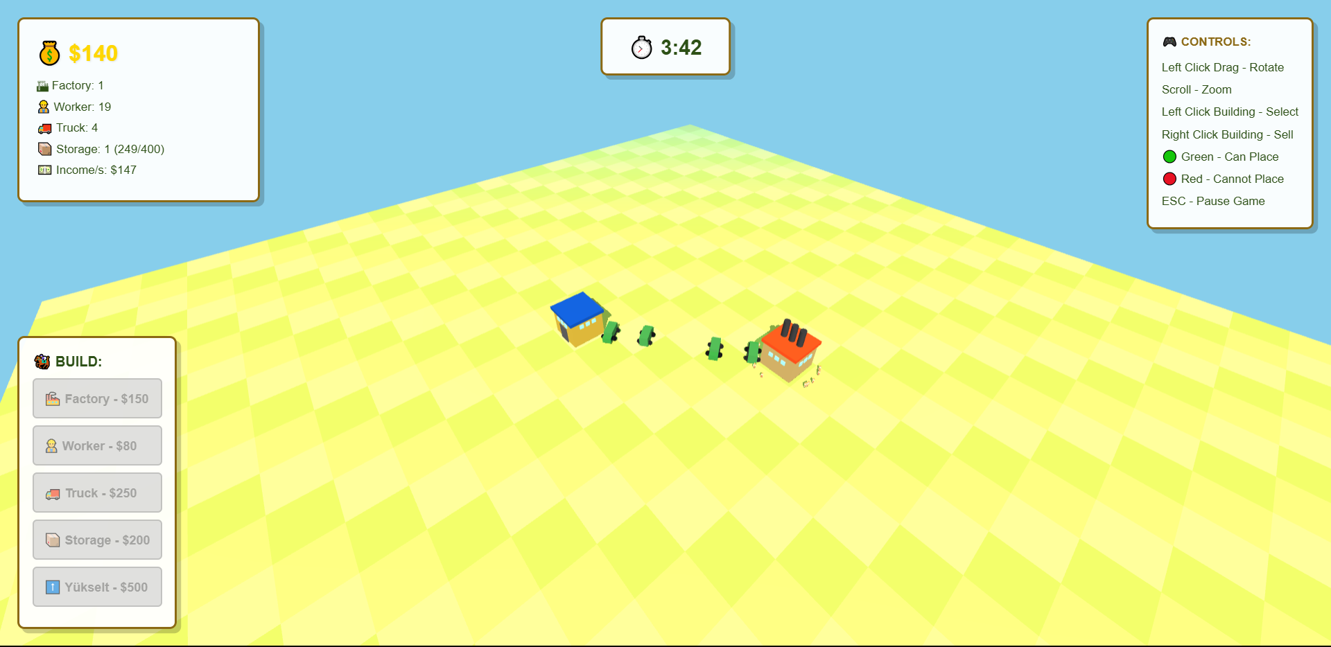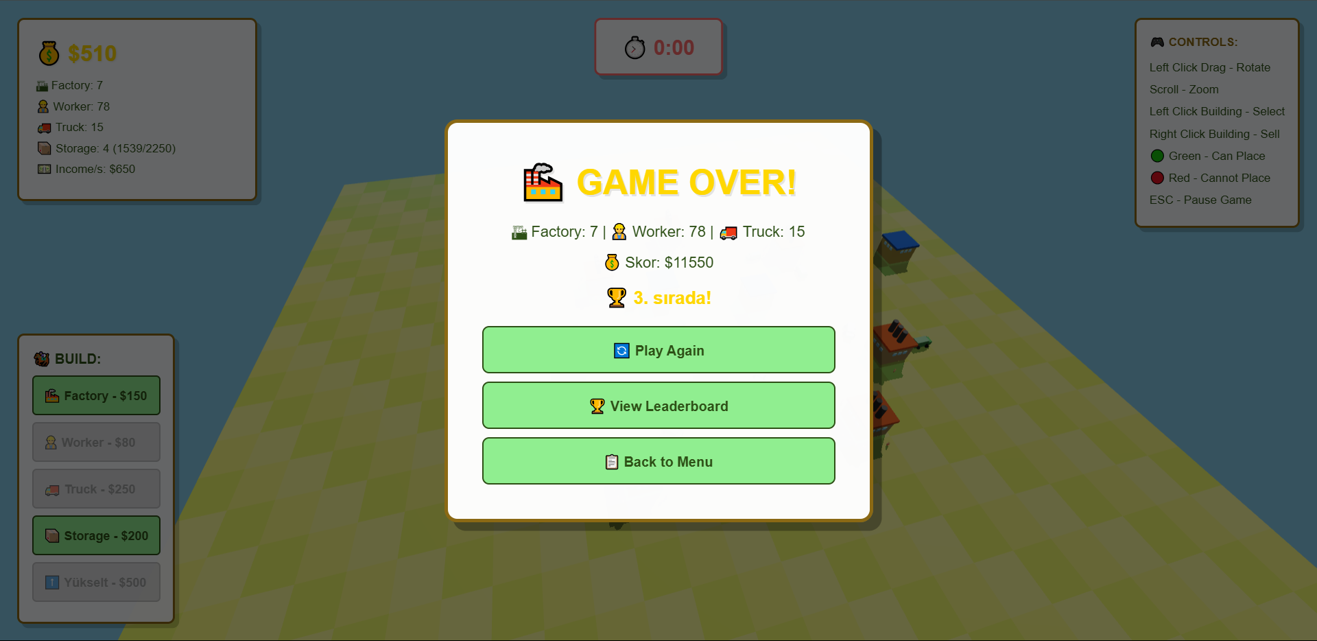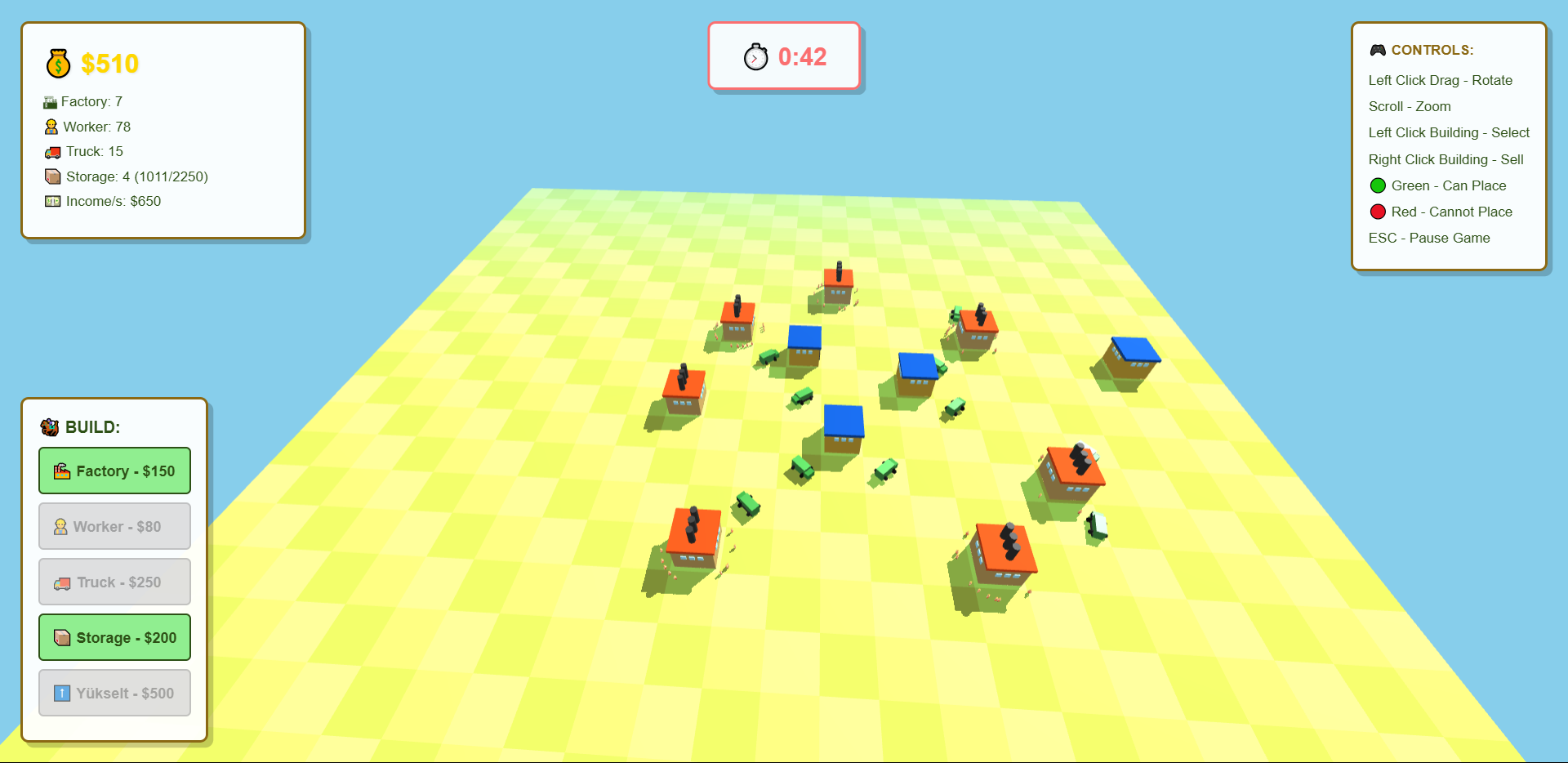 Place factories, assign workers, deploy trucks, and manage storage—all while racing against the clock. Every decision counts: layout, upgrades, and timing will determine your final score.