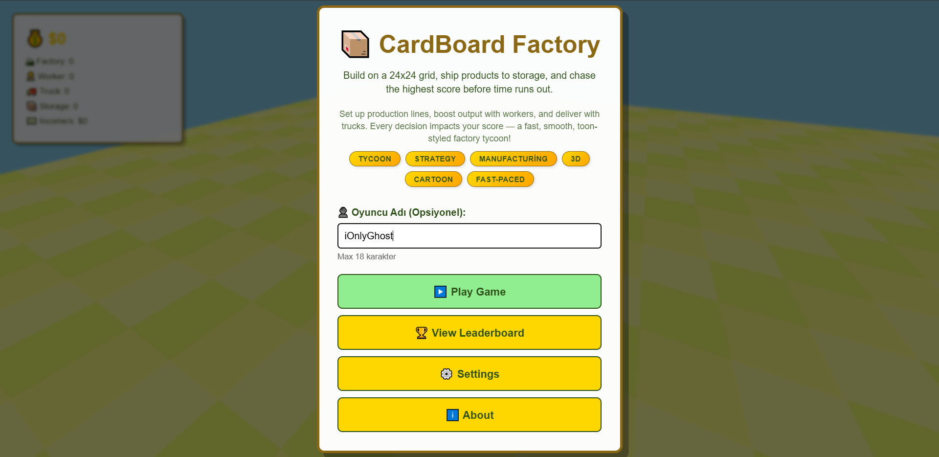 CardBoard Factory is a compact, isometric factory-building game where efficiency is everything. With limited space and time, you must design a production flow that maximizes output and minimizes bottlenecks.